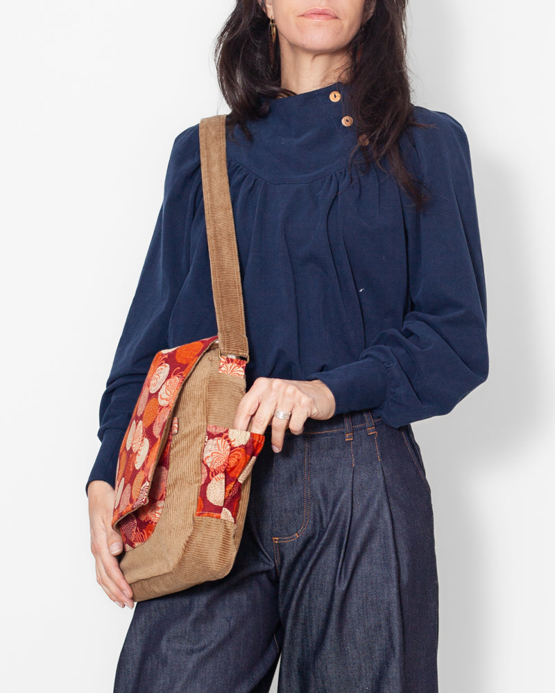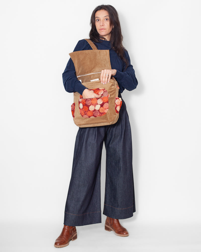 Le sac est en velours bio avec renfort, le tissu à motif est un coton japonais, la doublure est un gros grain de coton bio.