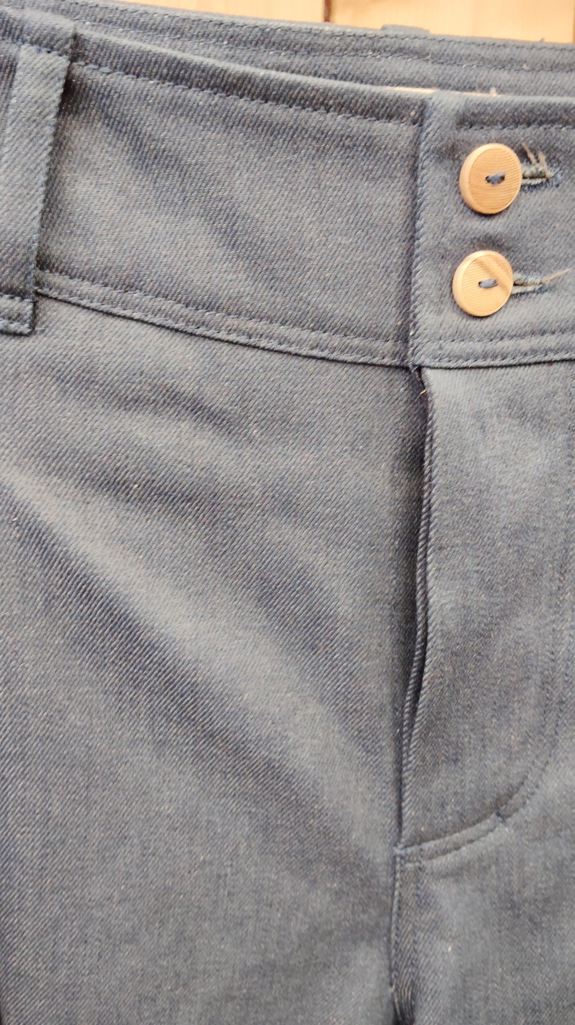 Pantalon long en denim de coton Up-cyclé avec des plis devant, des boutons en bois MI taille haute pinces dans le dos, une belle coupe large, fabriqué dans notre atelier à Montpellier.