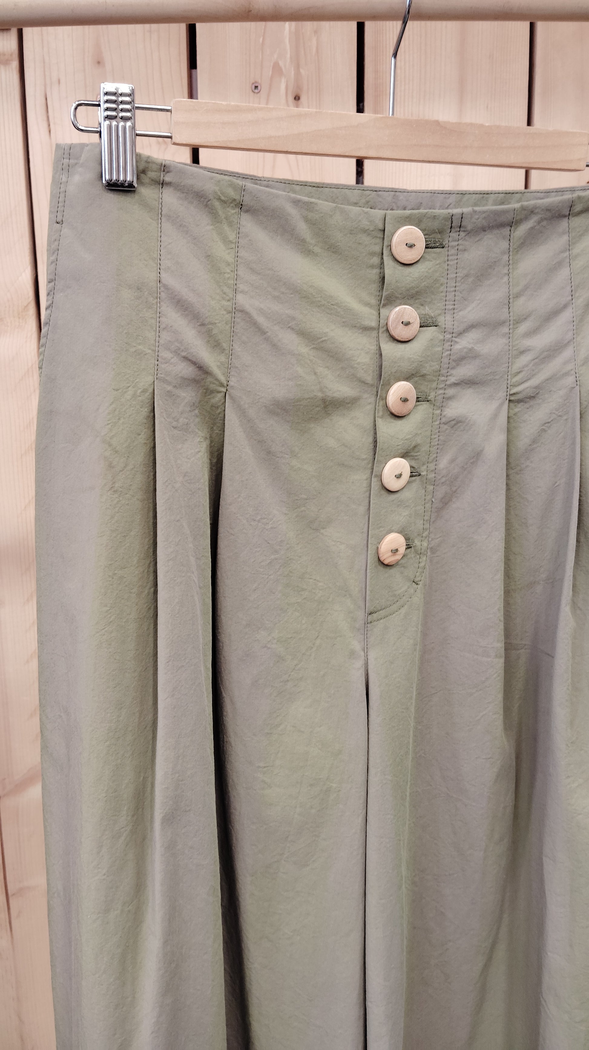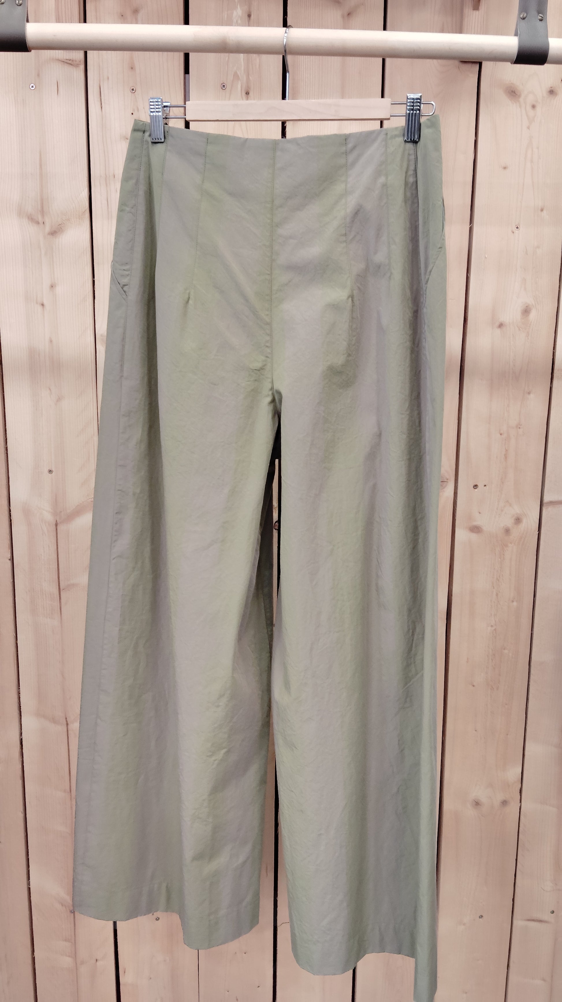 Pantalon Manon couleur kaki avec rayures ton sur ton. Beaux plis devant, beaux boutons en bois. Pinces dans le dos. Composition coton up-cyclé.