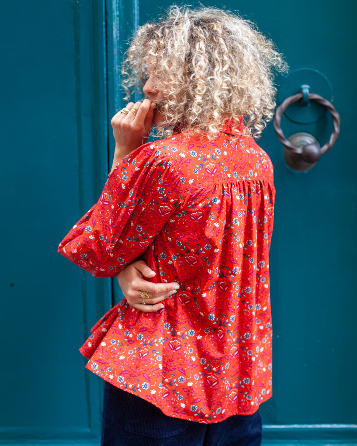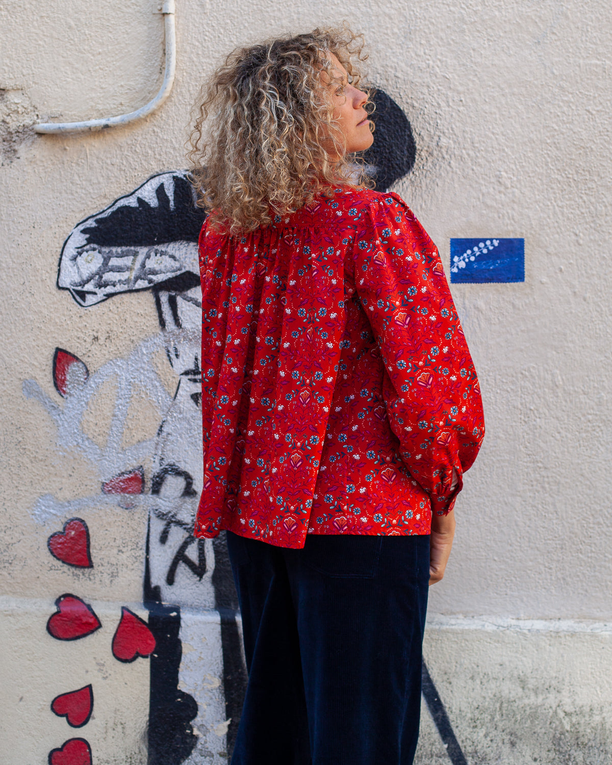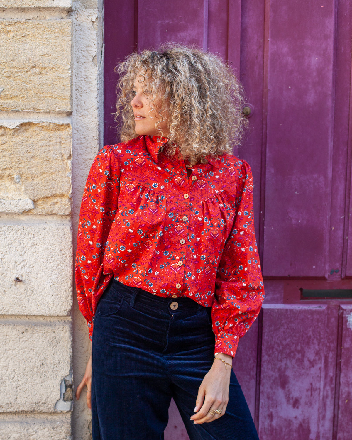 La chemise Amina est directement inspirée de la blouse avec un magnifique travail de découpe, de volume et de fronces. Elle est réalisée dans une popeline de coton haut de gamme. Son rouge éclatant est parfait pour une tenue pleine de vitalité. Fabriquée avec soin dans notre atelier, elle est taillée un peu petite au niveau de la carrure, je conseille de prendre une taille au dessus de celle habituelle.