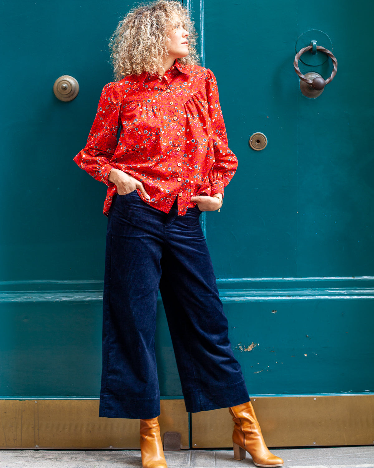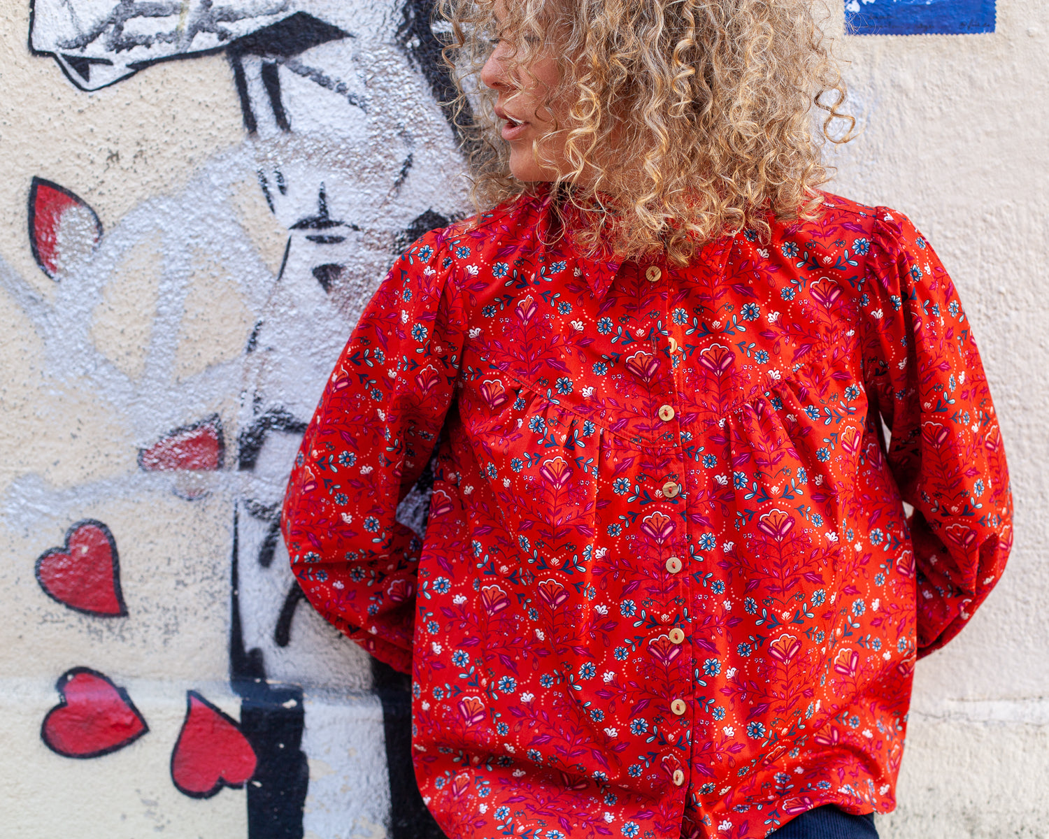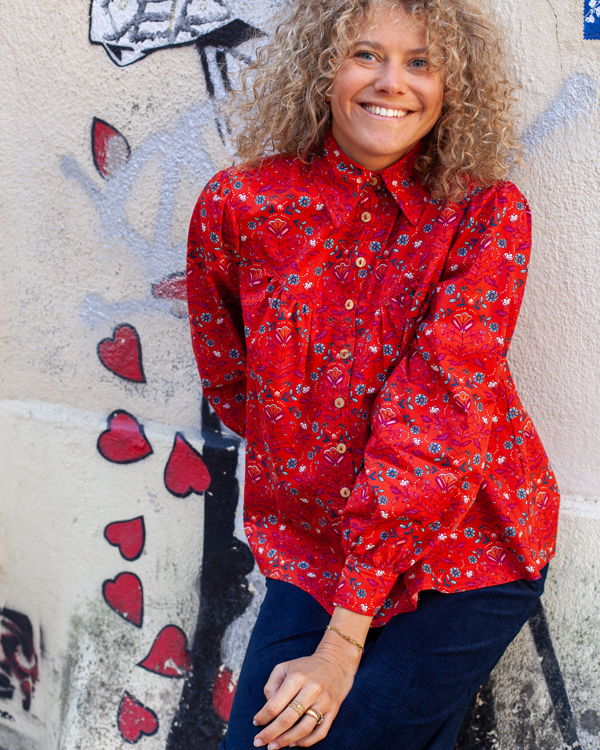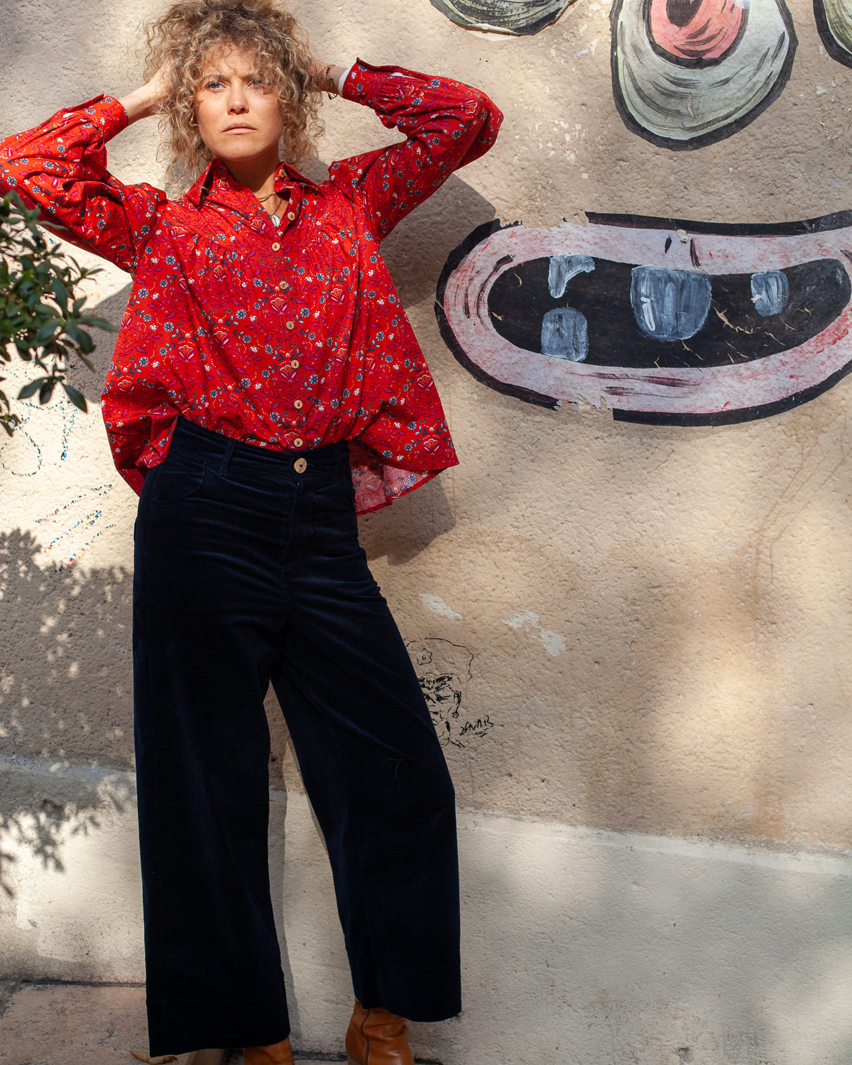 La chemise Amina est directement inspirée de la blouse avec un magnifique travail de découpe, de volume et de fronces. Elle est réalisée dans une popeline de coton haut de gamme. Son rouge éclatant est parfait pour une tenue pleine de vitalité. Fabriquée avec soin dans notre atelier, elle est taillée un peu petite au niveau de la carrure, je conseille de prendre une taille au dessus de celle habituelle.