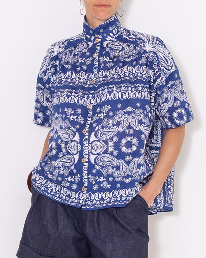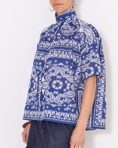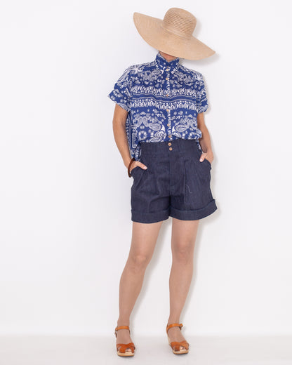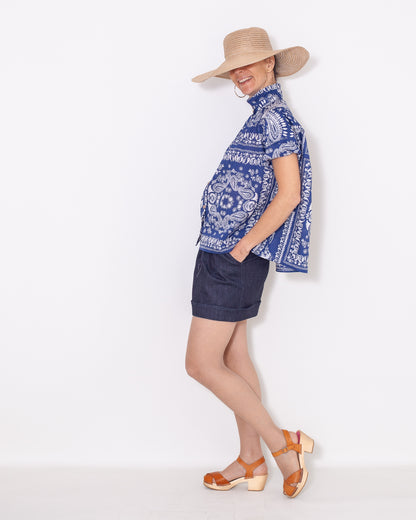 Un incontournable Atelier Tiket , en voile de coton avec un imprimé entre végétal, Inde et baroque, son beau bleu et son blanc m'ont fait penser à la Grèce. Elle est parfaite pour l'été et tellement élégante! Fabriquée avec soin dans notre atelier de confection à Montpellier, cette chemise allie élégance et confort pour un style intemporel avec sa coupe over-size.