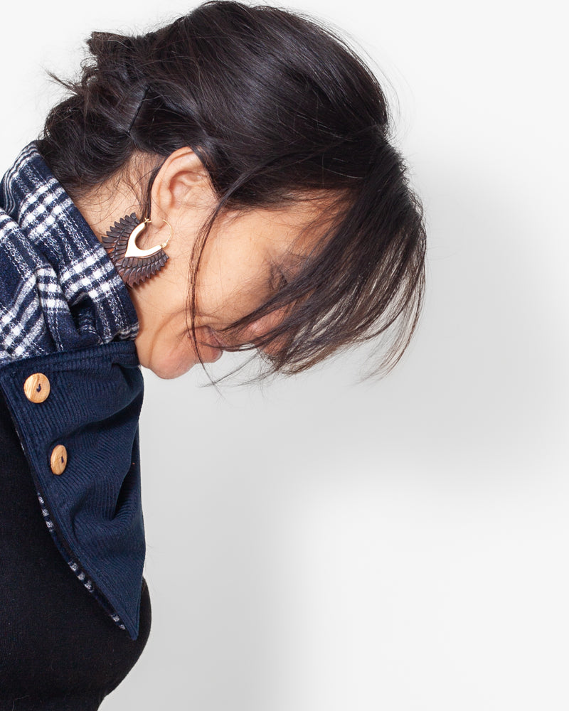Comme souvent dans l’atelier, il est né de nos fins de stock : velours bio, tissus japonais, laine… que je transforme en pièces éthiques grâce à l’upcycling.
