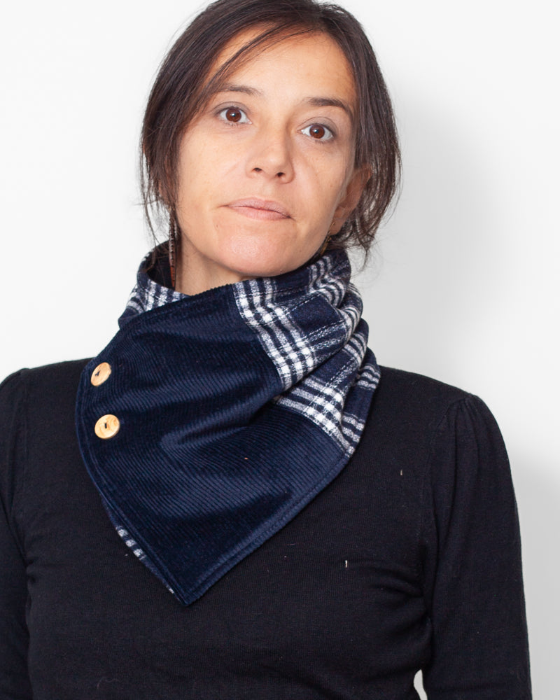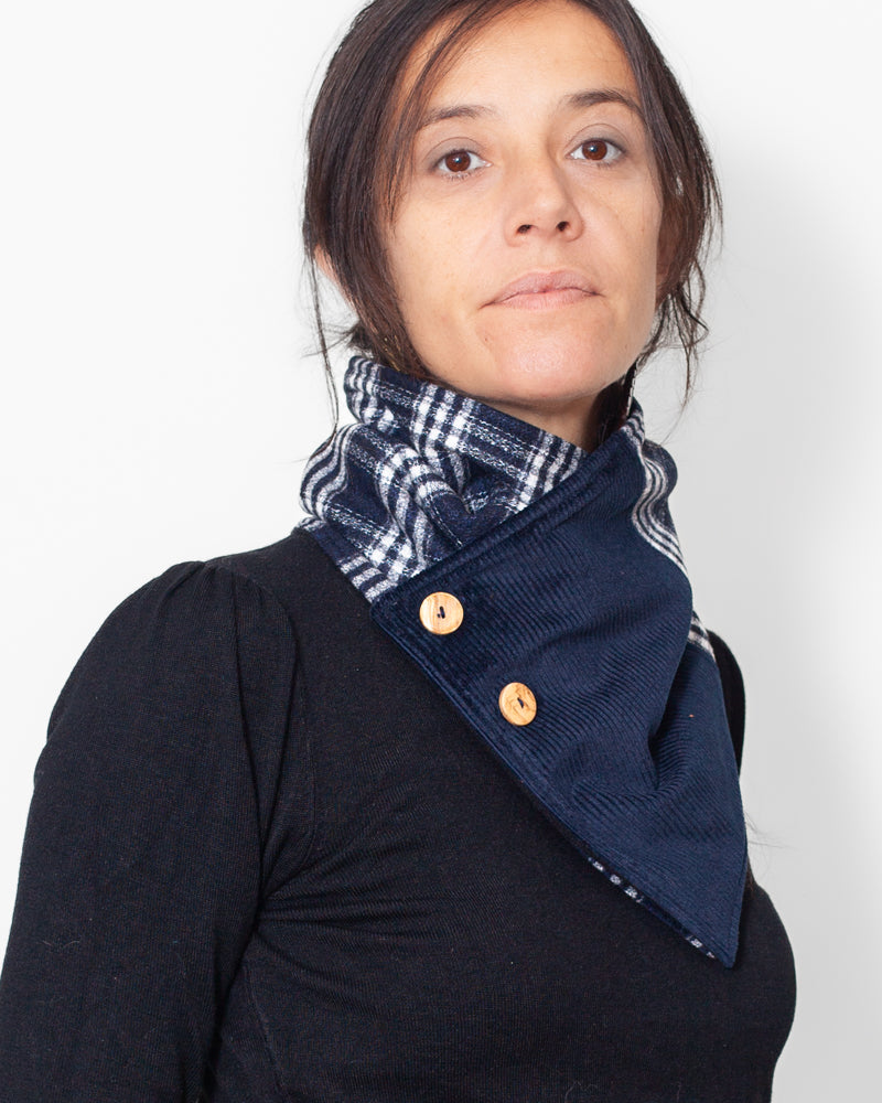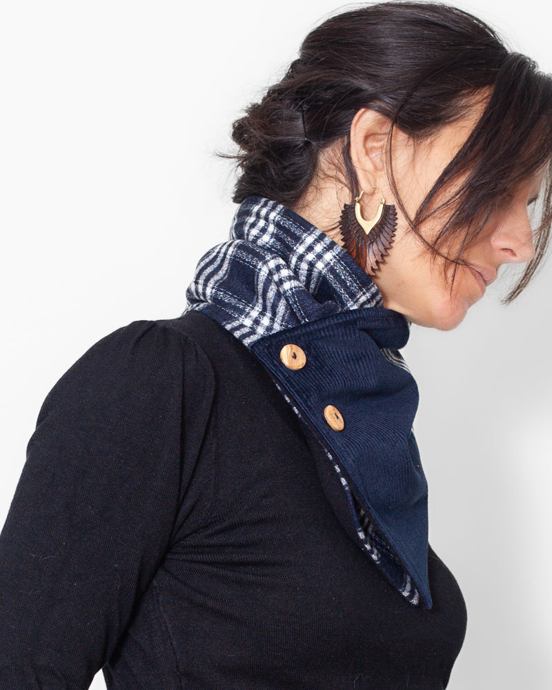 Le chèche se ferme avec trois boutons en bois et se pose naturellement près du cou, tout doux et bien chaud.