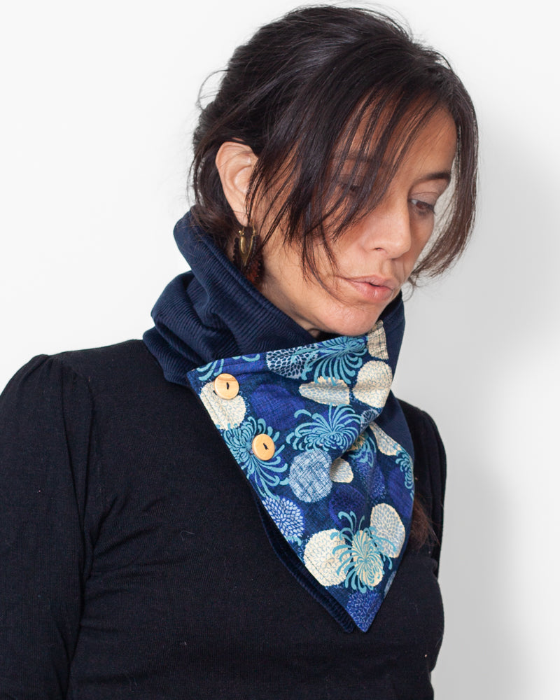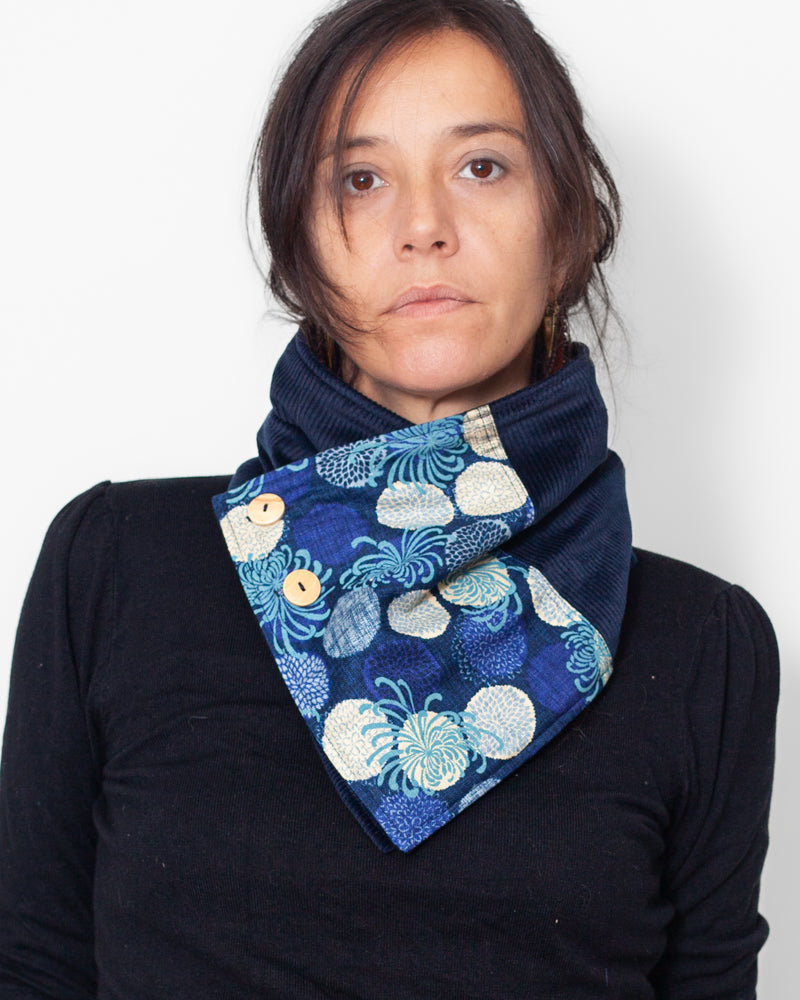 Le chèche se ferme avec trois boutons en bois et se pose naturellement près du cou, tout doux et bien chaud.