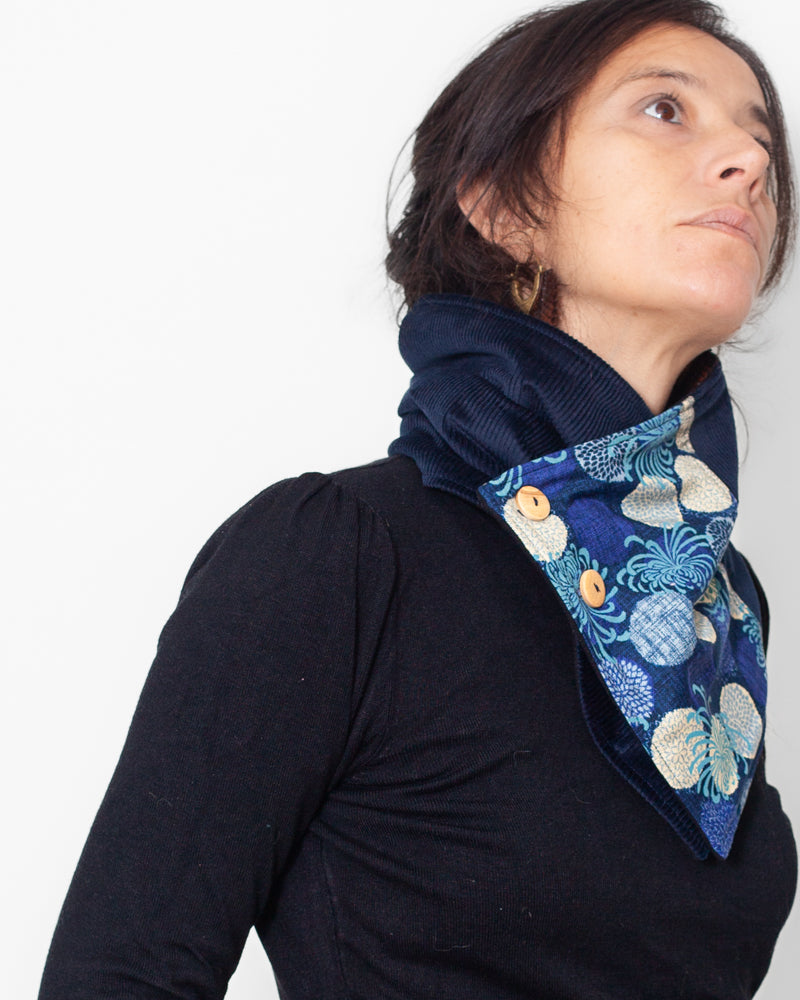 Comme souvent dans l’atelier, il est né de nos fins de stock : velours bio, tissus japonais, laine… que je transforme en pièces éthiques grâce à l’upcycling.