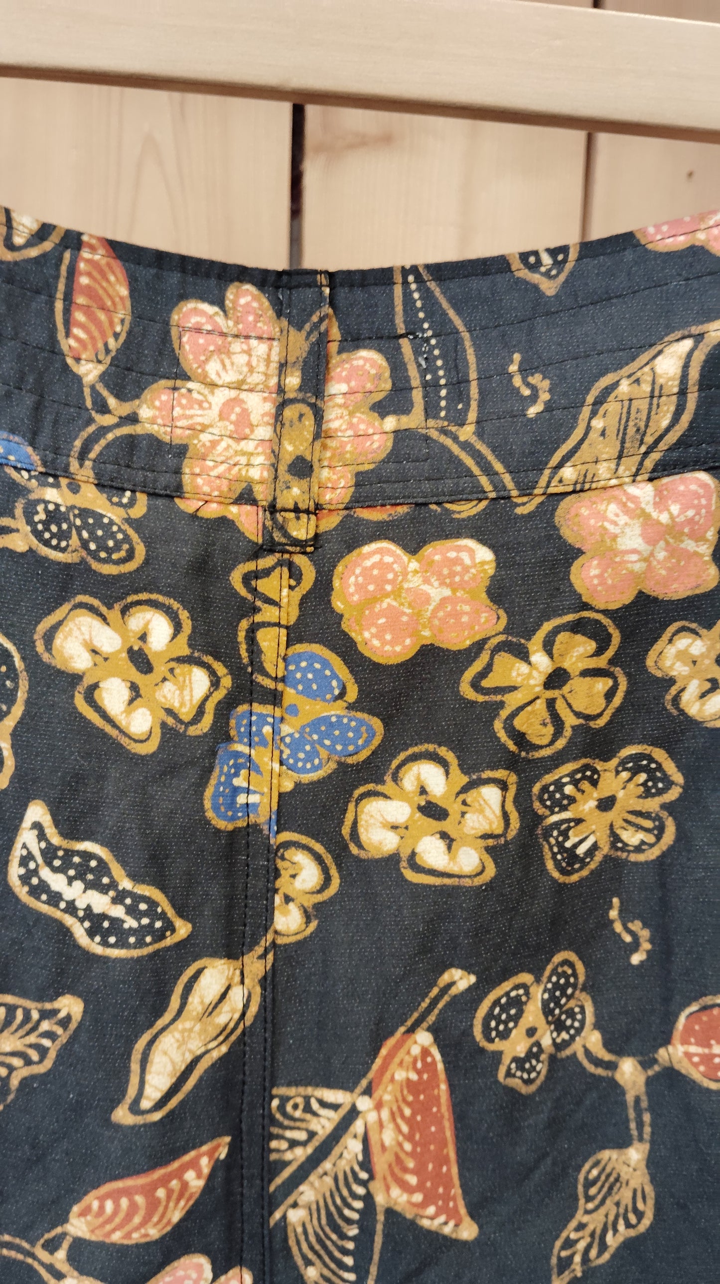 Pantalon plutôt taille haute, plis devant, pinces dos. Magnifique tissu up-cyclé.