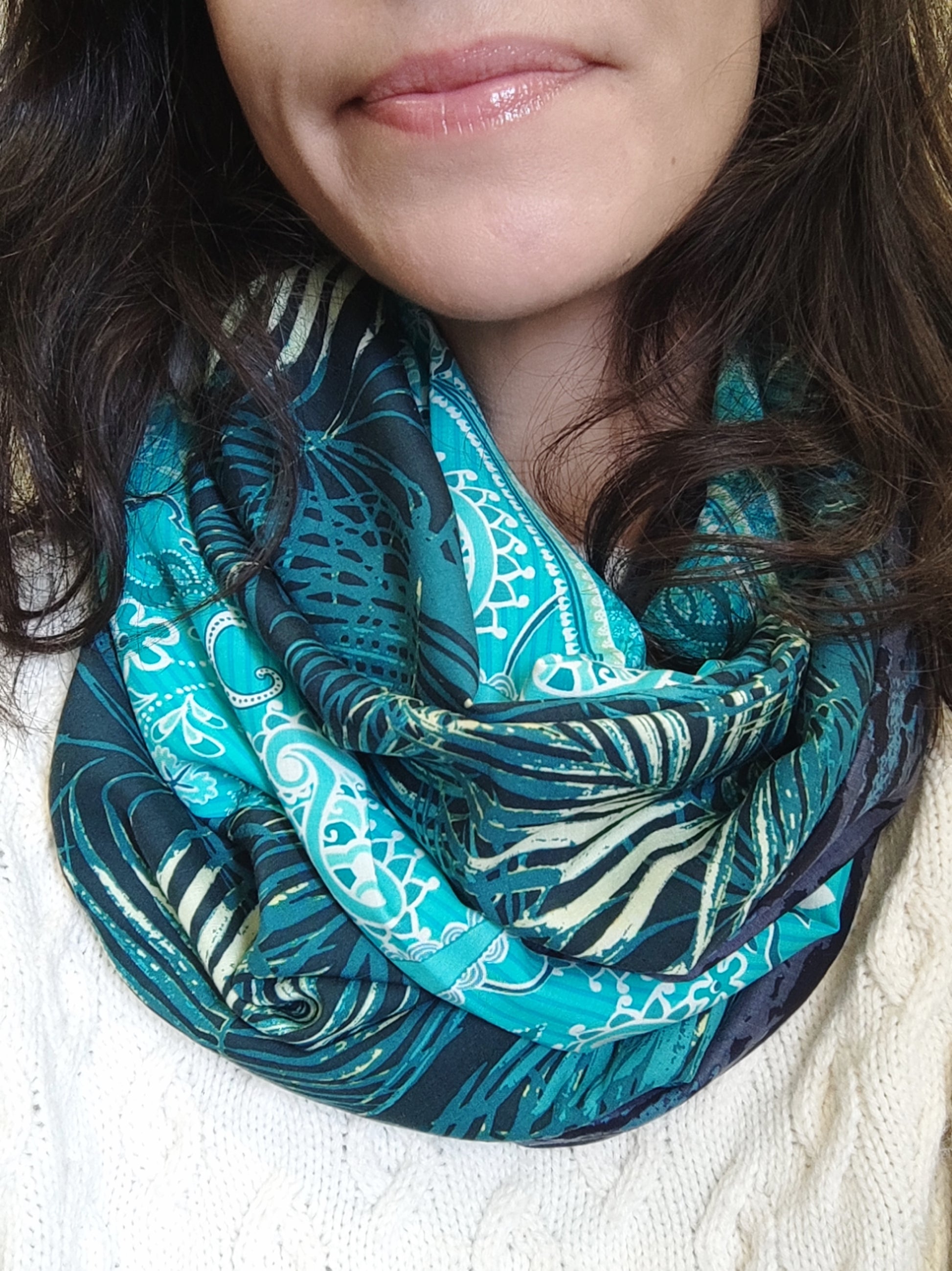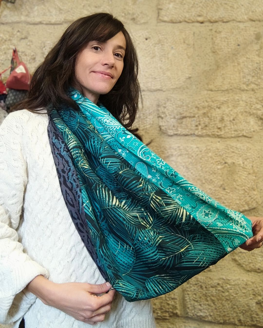 Réalisé dans les fins de stock de tissus de marques, le snood trio est souple et lumineux. Il est parfait pour égayer une tenue hivernale ou printanière.