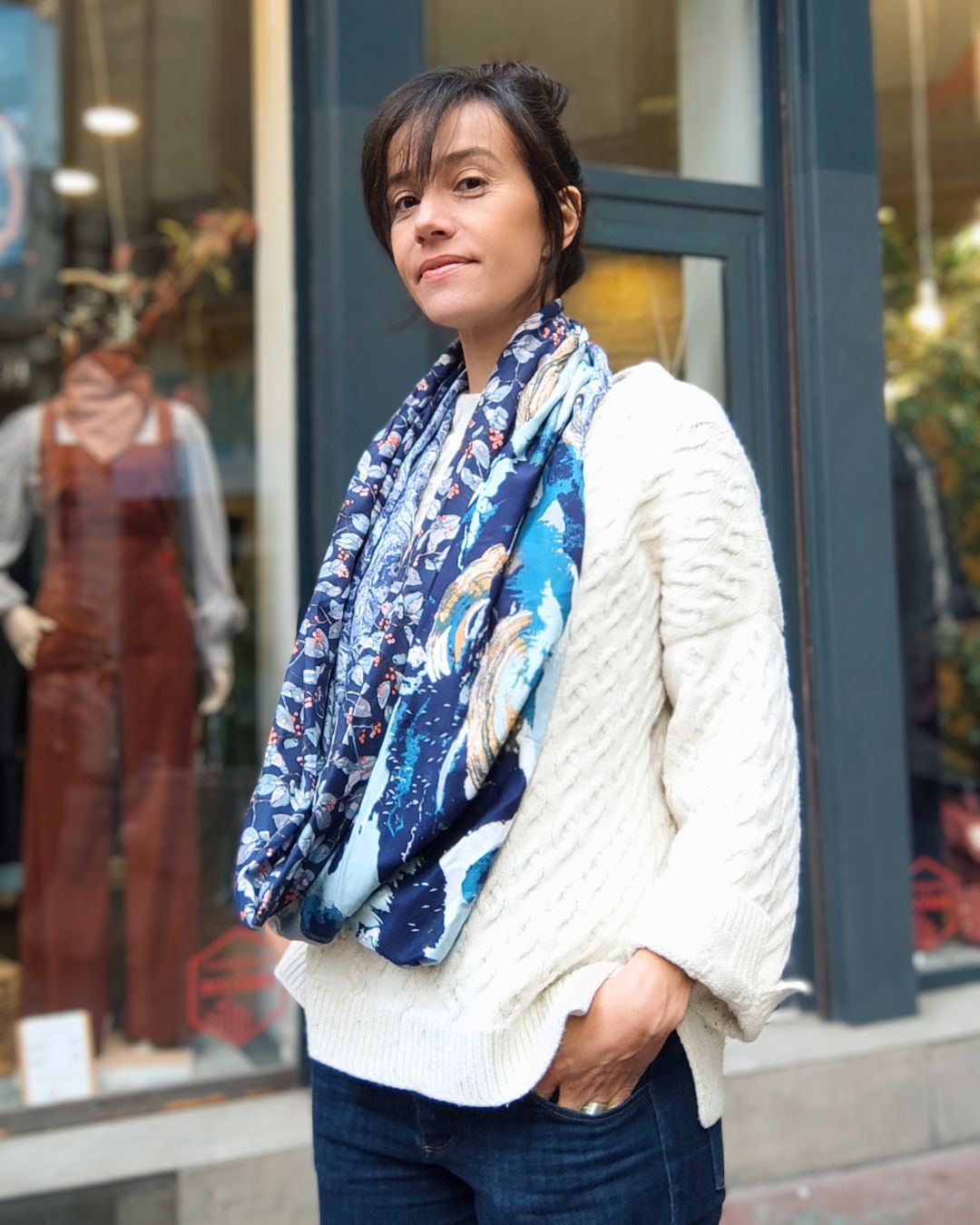 Réalisé dans les fins de stock de tissus de marques, le snood trio est souple et lumineux. Il est parfait pour égayer une tenue hivernale ou printanière.