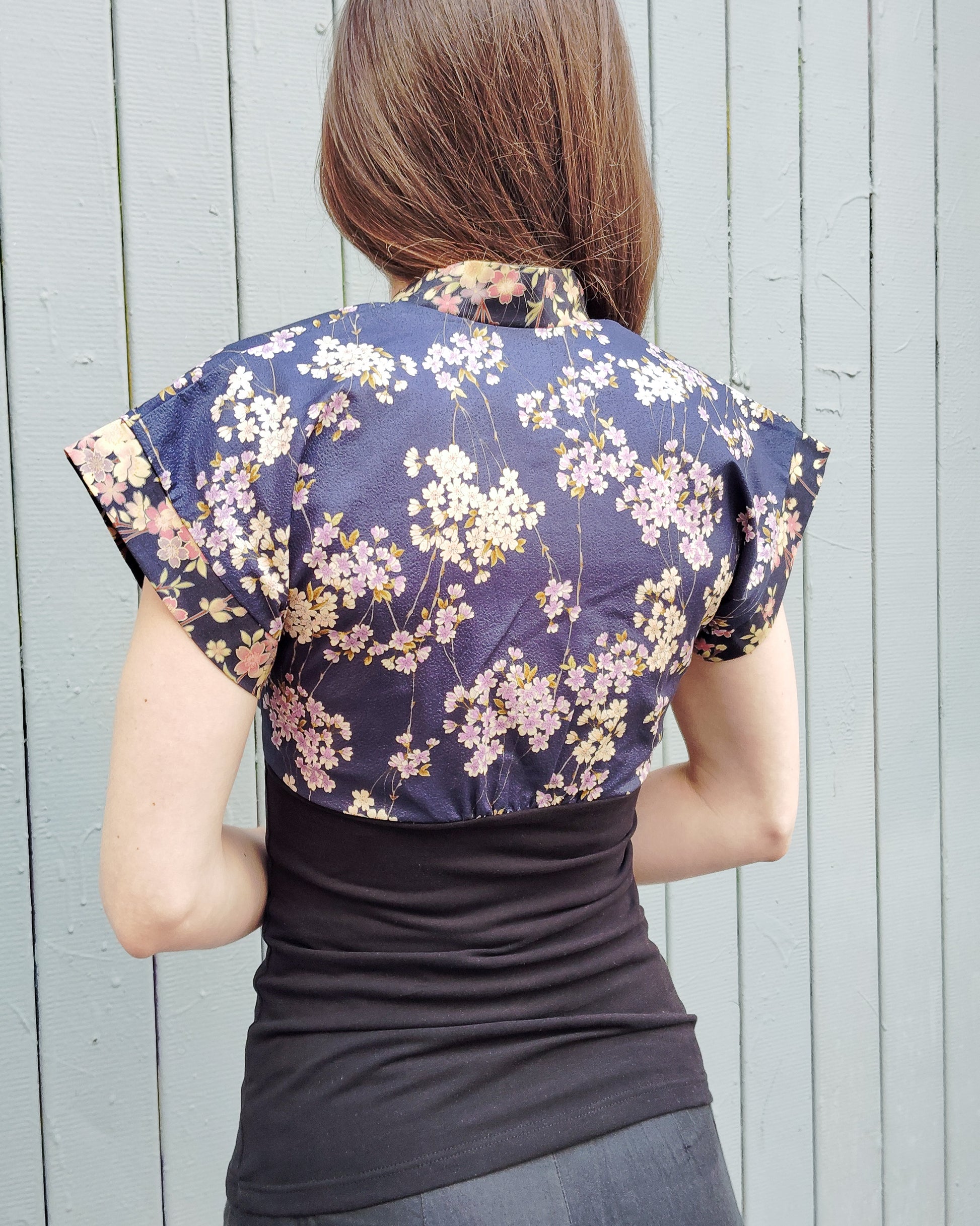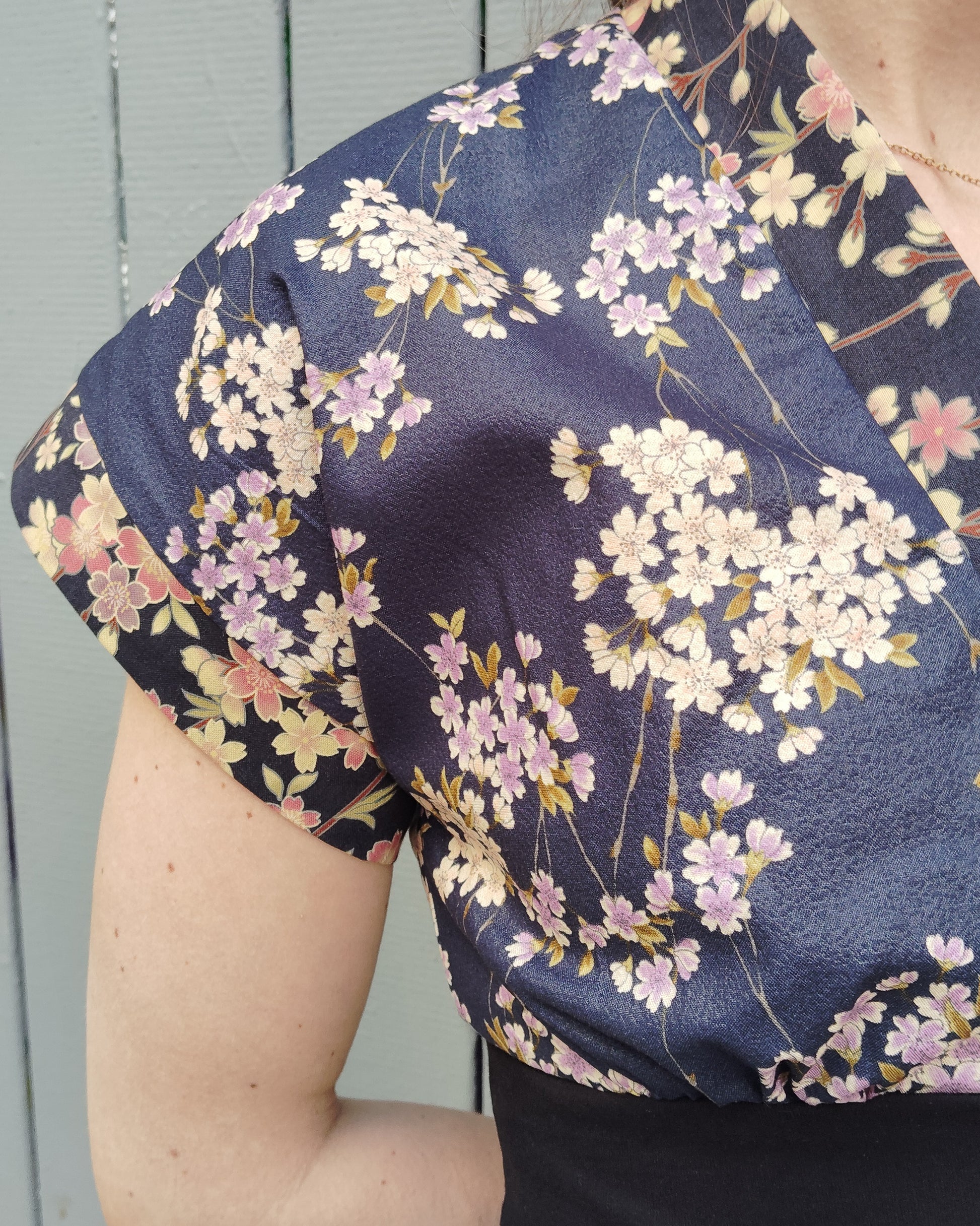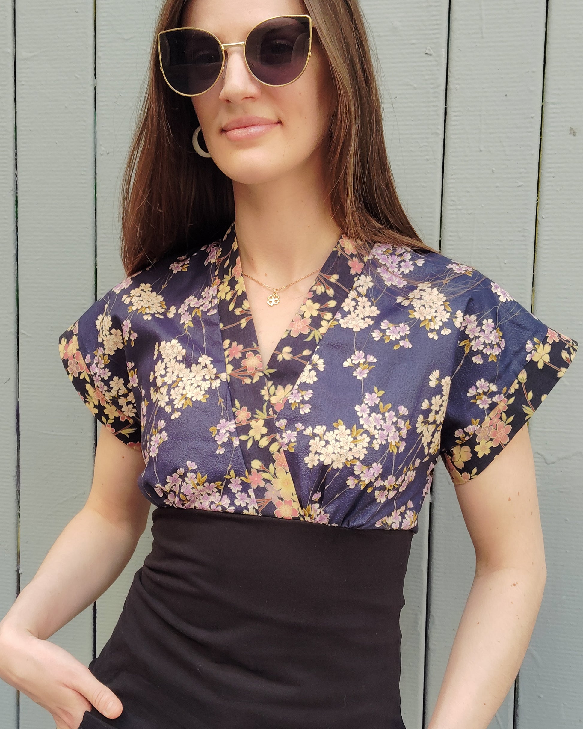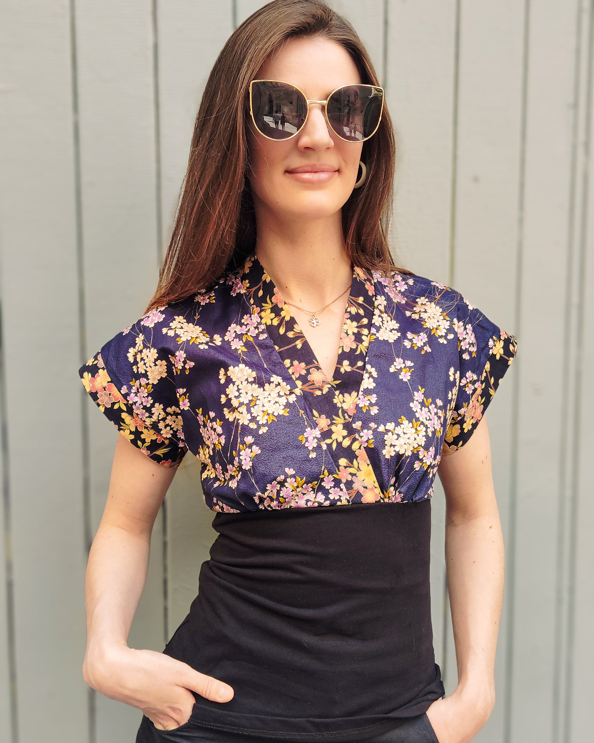 Notre iconique top kim, haut inspiré du kimono en tissu japonais de grande qualité en coton souple et léger. Imprimé floral plein de couleurs et de lumière. Coupe ajustée, les fronces donnent du volume sous la poitrine. Tenue chic et décontracte qui sort décidément de l'ordinaire. La partie noire est en jersey de coton Bio Gots avec 3% d’élasthanne pour le confort.