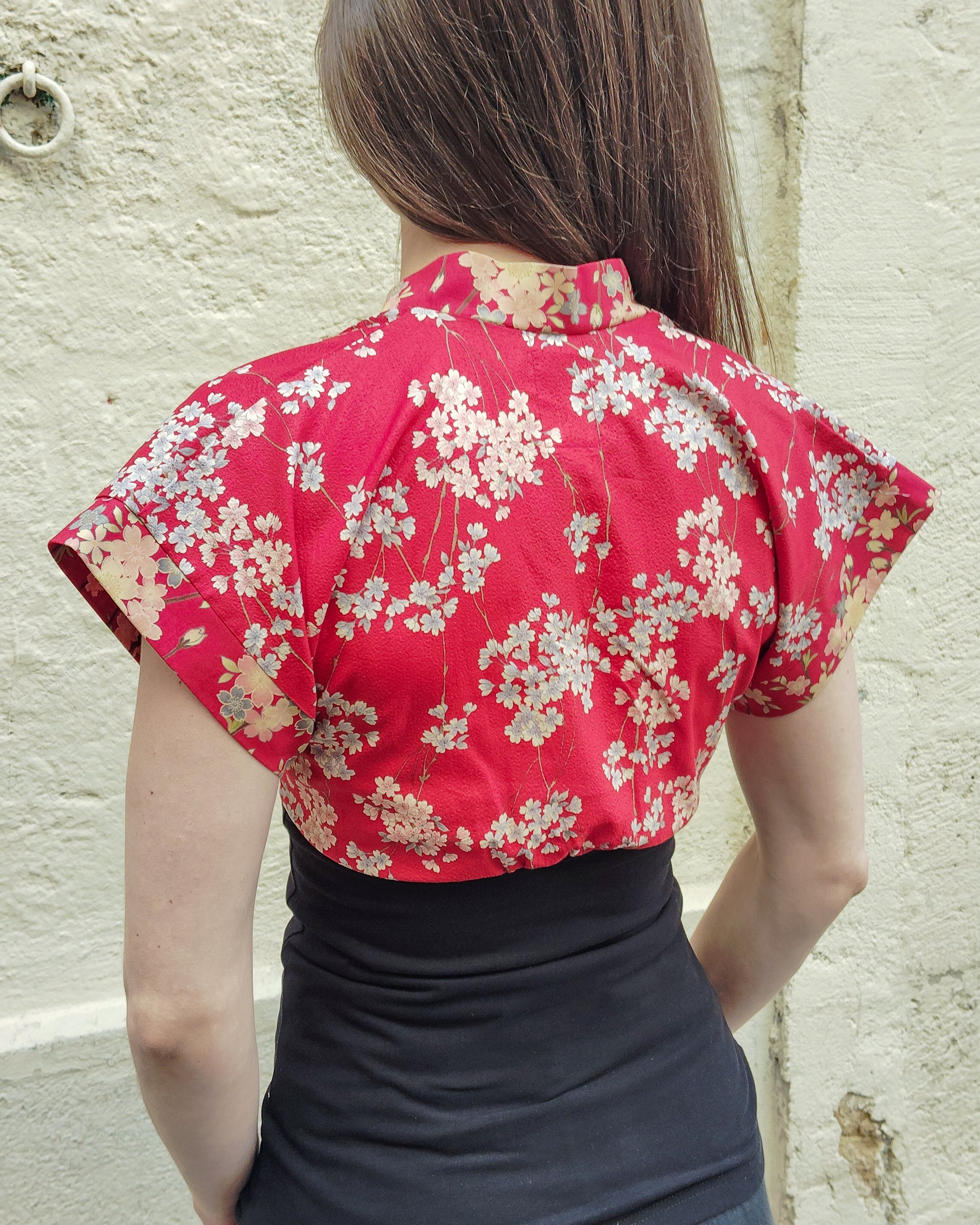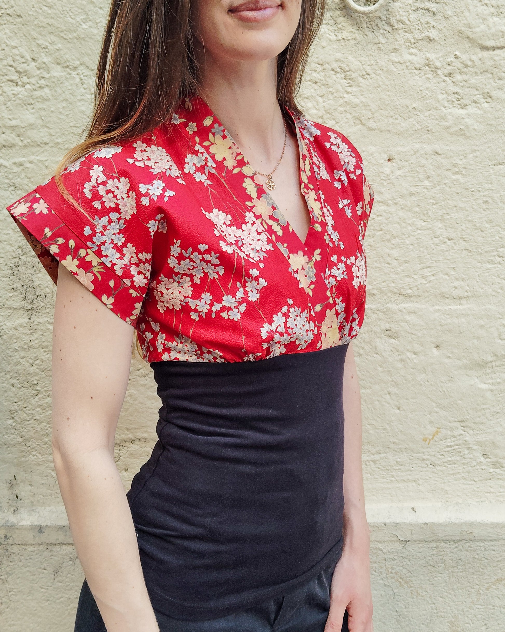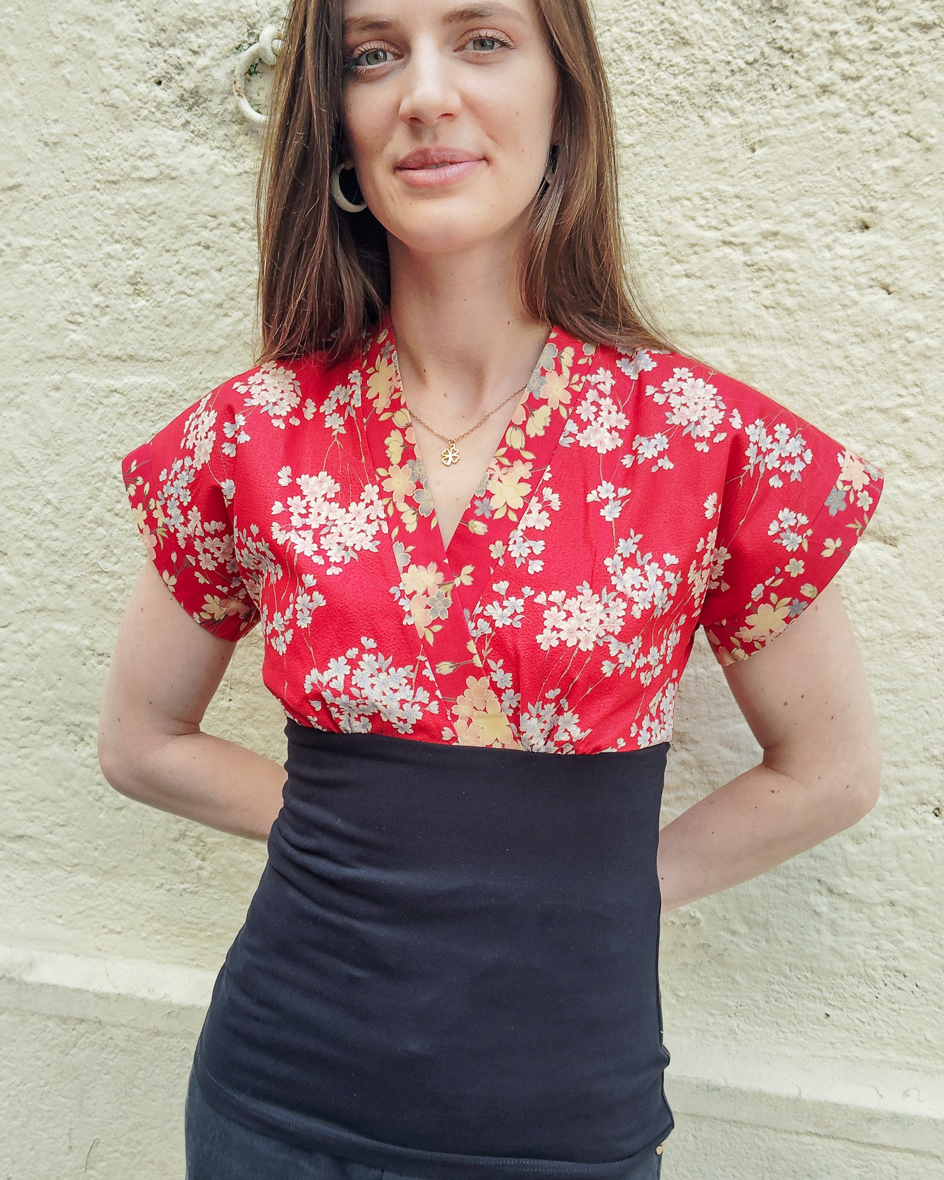 Notre iconique top kim, haut inspiré du kimono en tissu japonais de grande qualité en coton souple et léger. Imprimé floral plein de couleurs et de lumière. Coupe ajustée, les fronces donnent du volume sous la poitrine. Tenue chic et décontracte qui sort décidément de l'ordinaire. La partie noire est en jersey de coton Bio Gots avec 3% d’élasthanne pour le confort.
