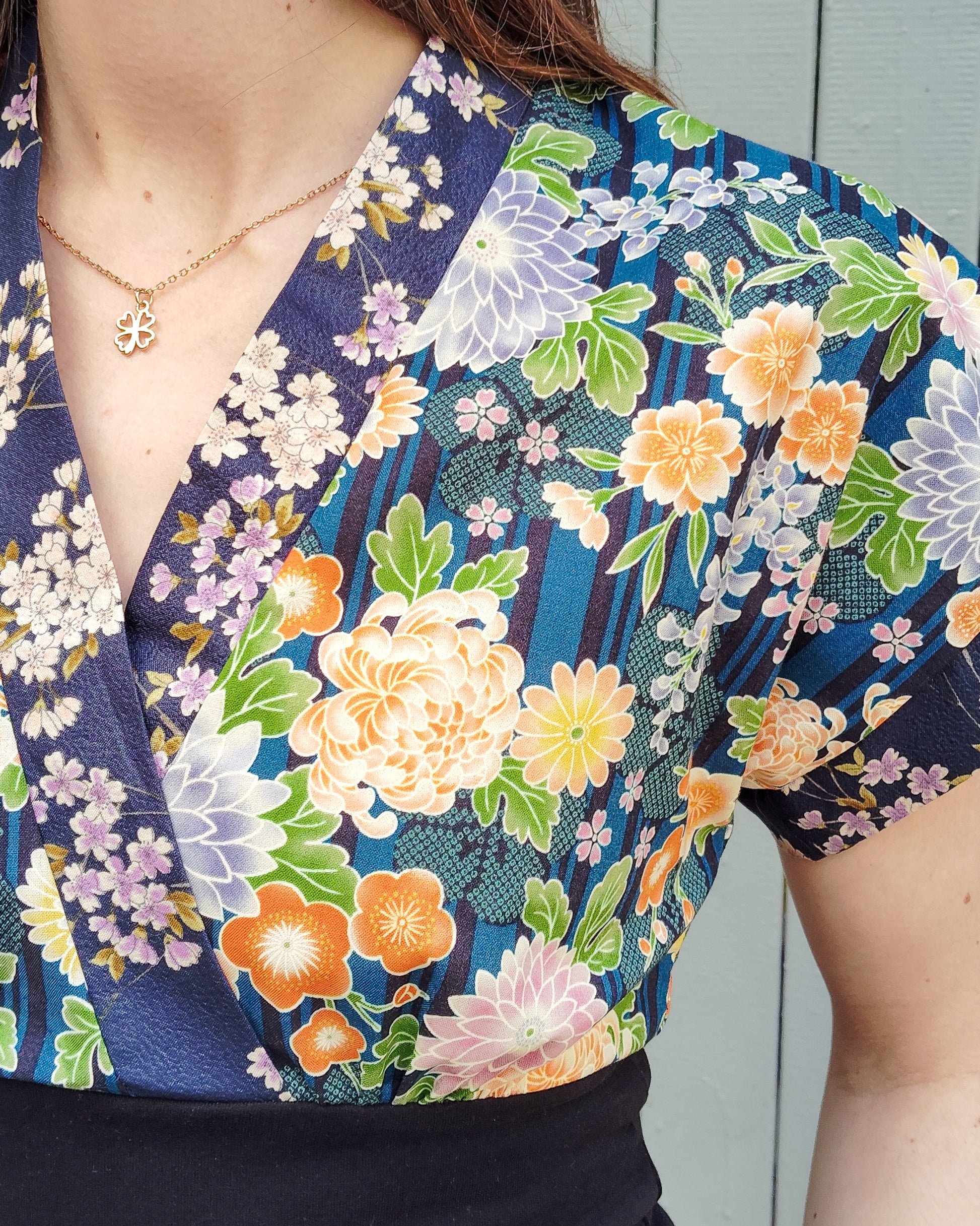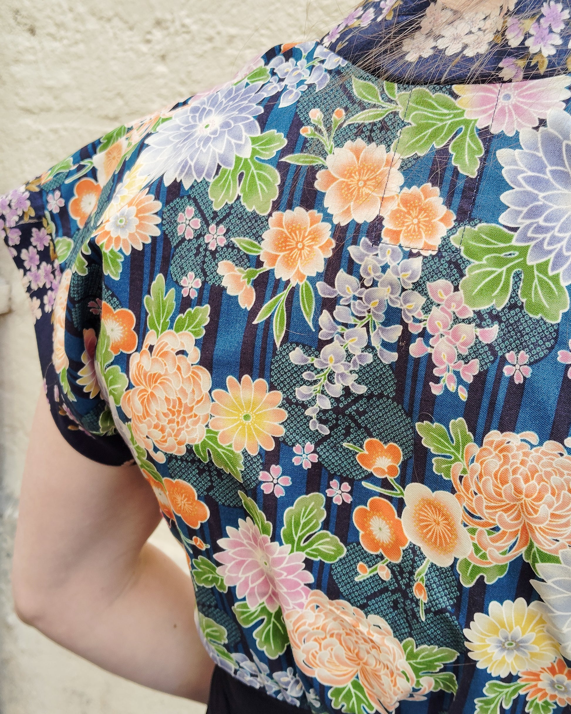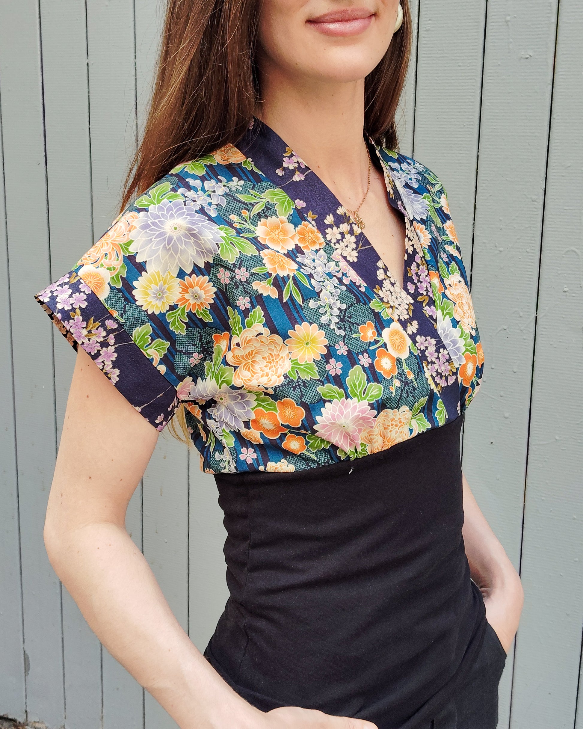 Notre iconique top kim, haut inspiré du kimono en tissu japonais de grande qualité en coton souple et léger. Imprimé floral plein de couleurs et de lumière. Coupe ajustée, les fronces donnent du volume sous la poitrine. Tenue chic et décontracte qui sort décidément de l'ordinaire. La partie noire est en jersey de coton Bio Gots avec 3% d’élasthanne pour le confort.