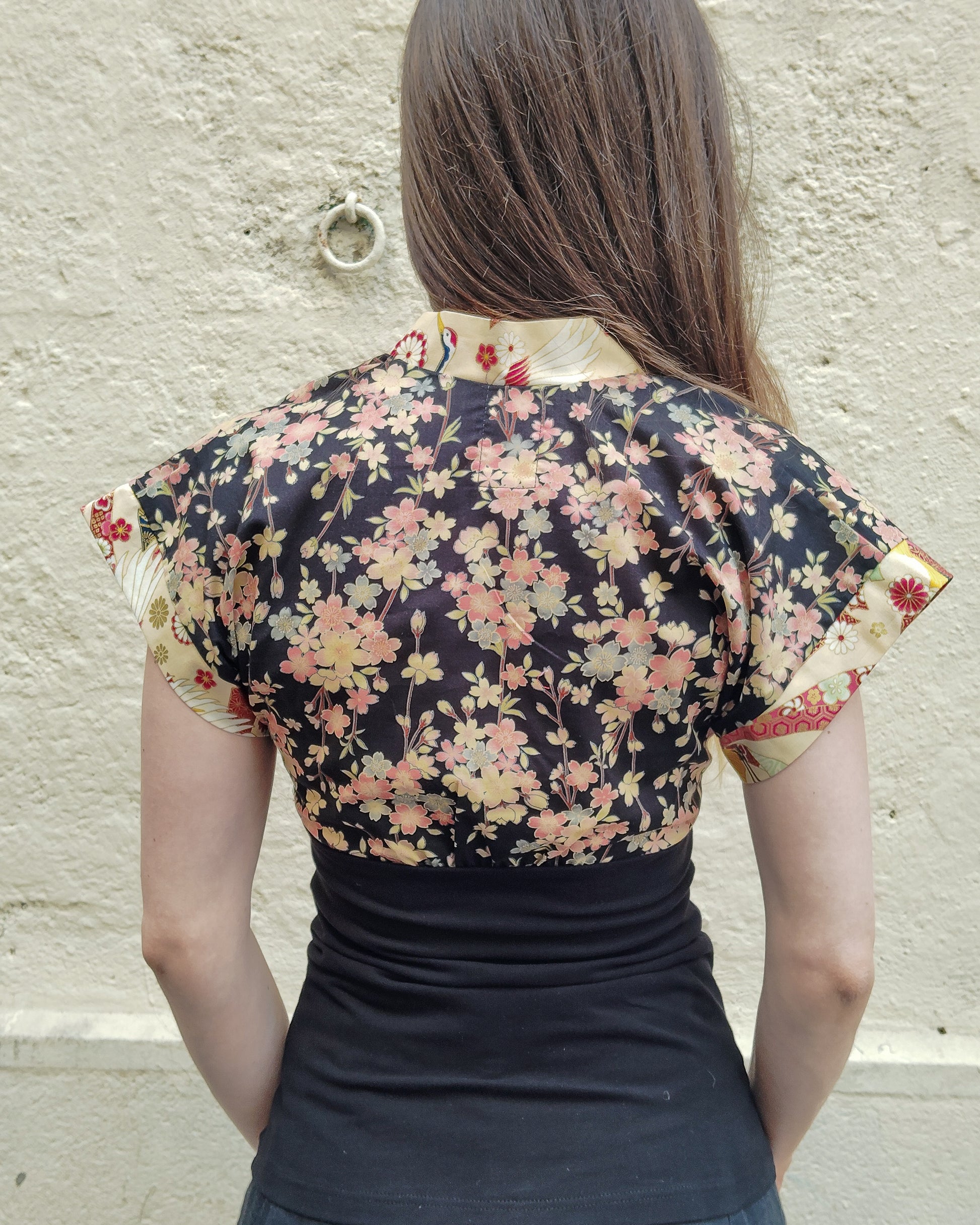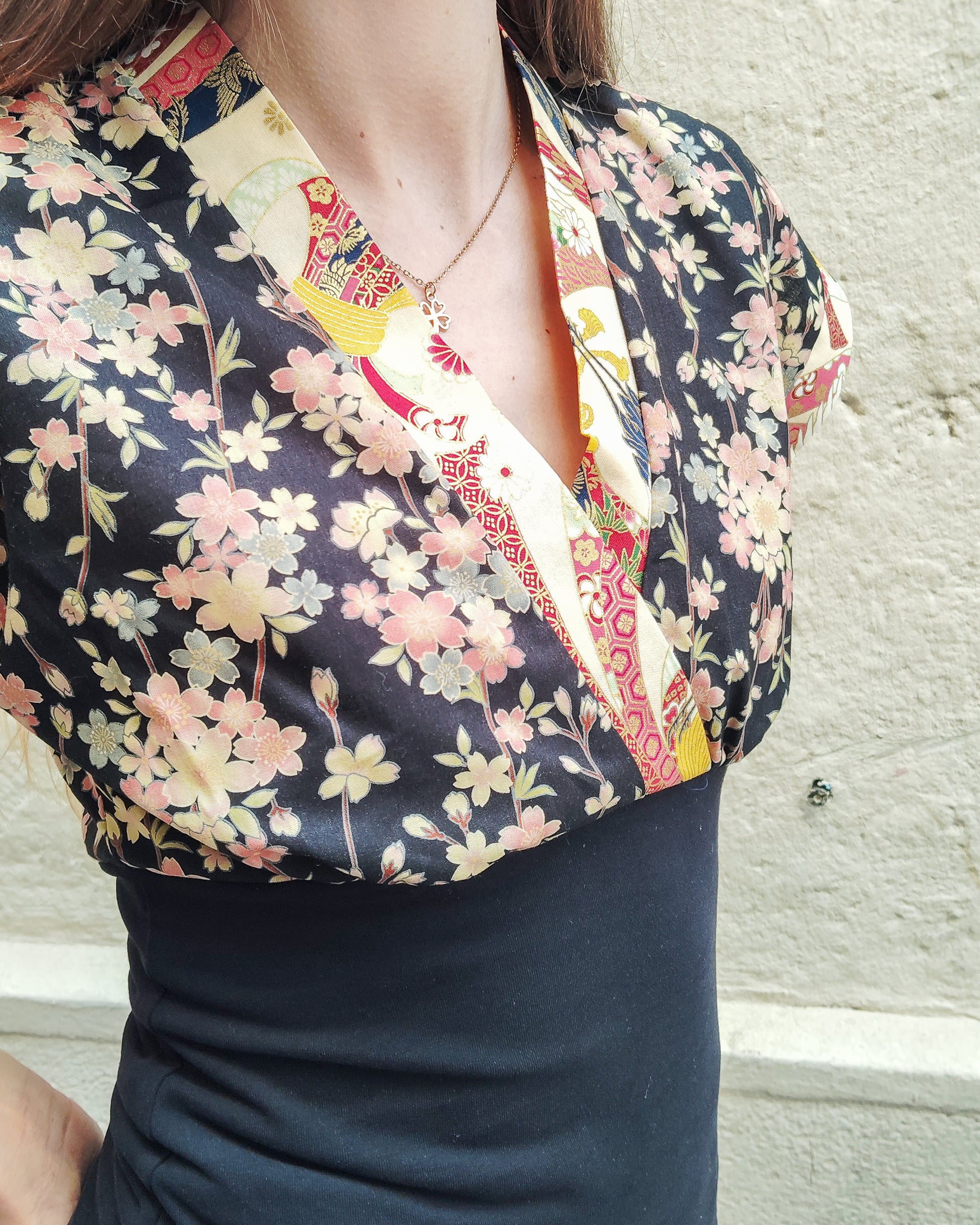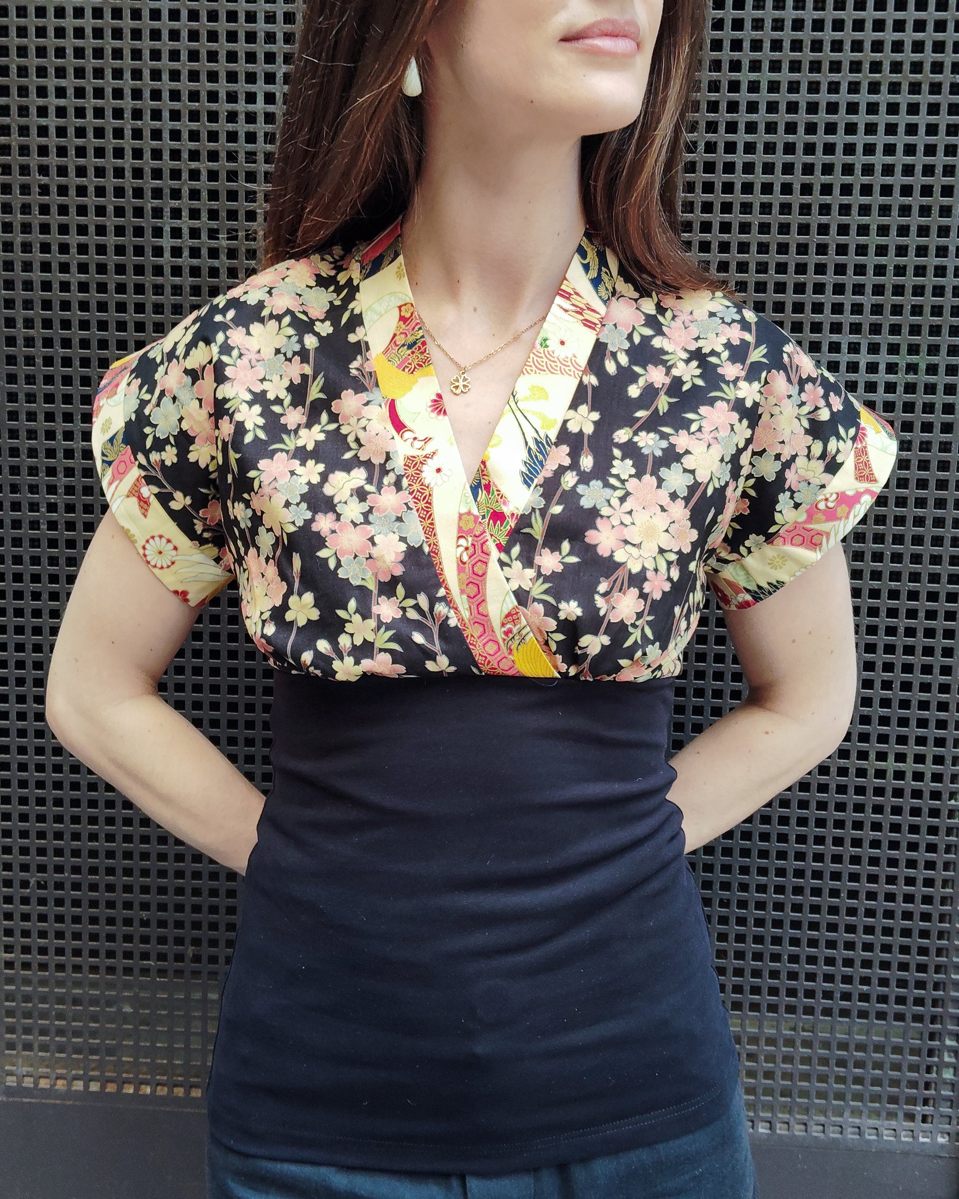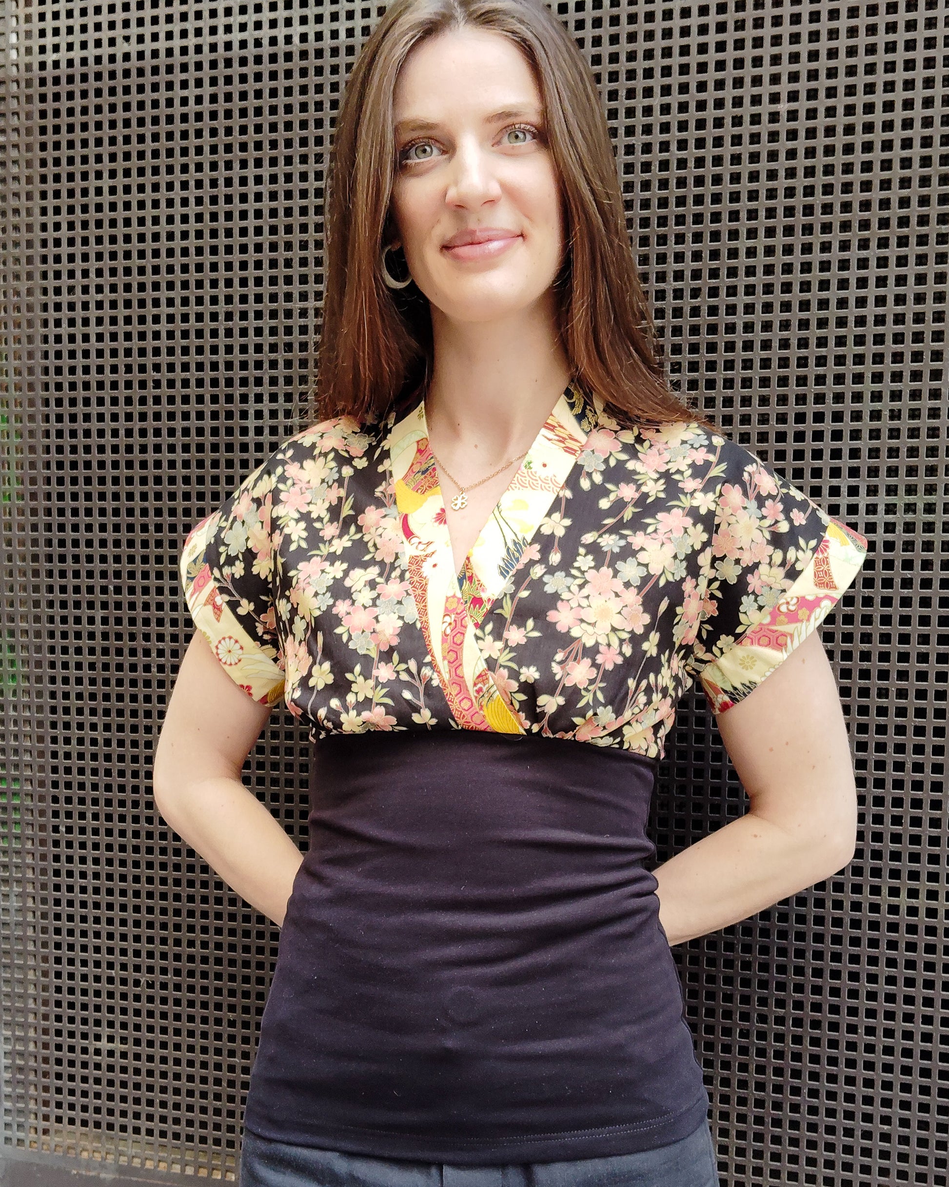 Notre iconique top kim, haut inspiré du kimono en tissu japonais de grande qualité en coton souple et léger. Imprimé floral plein de couleurs et de lumière. Coupe ajustée, les fronces donnent du volume sous la poitrine. Tenue chic et décontracte qui sort décidément de l'ordinaire. La partie noire est en jersey de coton Bio Gots avec 3% d’élasthanne pour le confort.